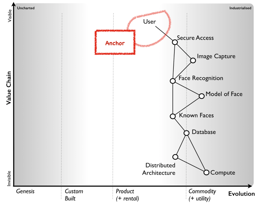 To borrow from Simon Wardley’s brilliant maps, every map has an anchor (the point it’s built around). For a geographical map, the anchor is the compass (this is north of that etc.).