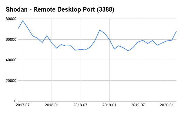 The number of devices exposing RDP to the Internet has grown over the past month which makes sense given how many organizations are moving to remote work. It’s surprising how the number of RDP instances actually went up after the initial Microsoft bulletin on Bluekeep in May 2019. And then it dropped sharply in August once a series of issues were revealed (DejaBlue) that impacted newer versions of RDP. A common tactic we’ve seen in the past by IT departments is to put an insecure service on a non-standard port (aka security by obscurity). To that point, this is how the exposure for RDP looks like on an alternate port (3388) that we’ve seen organizations use: